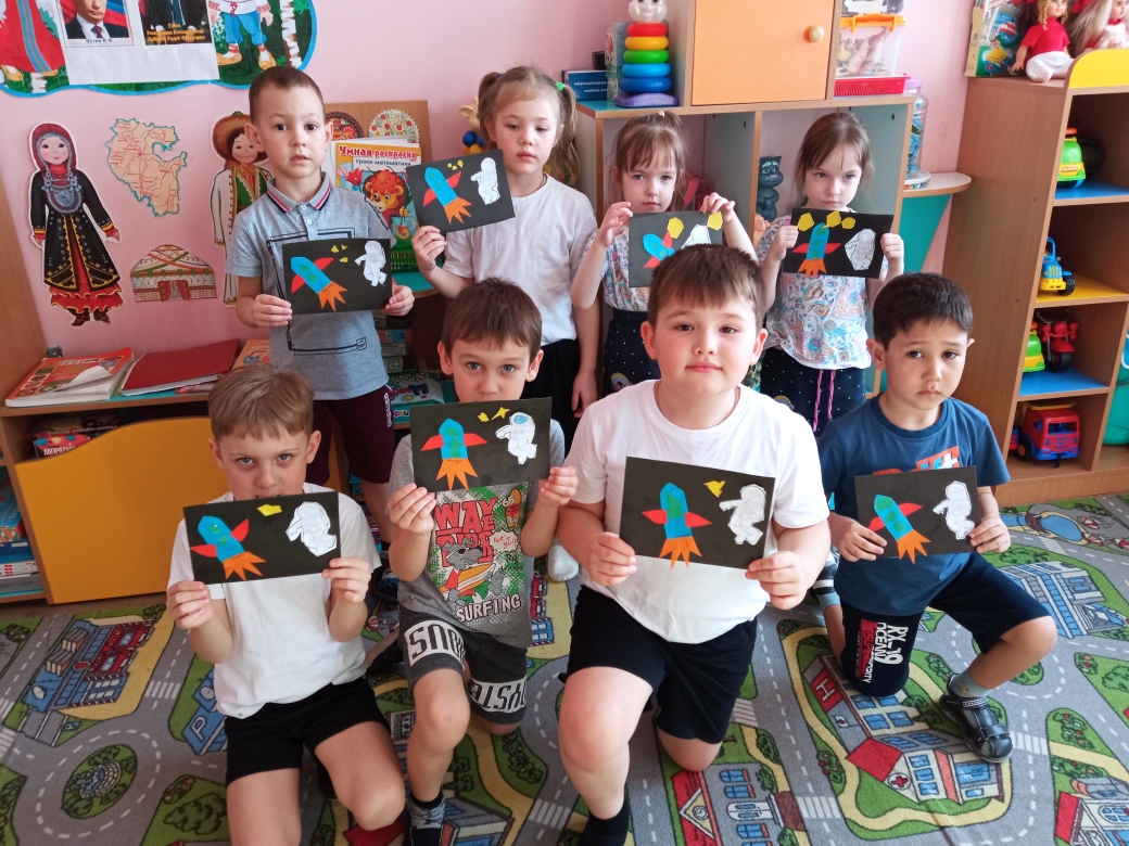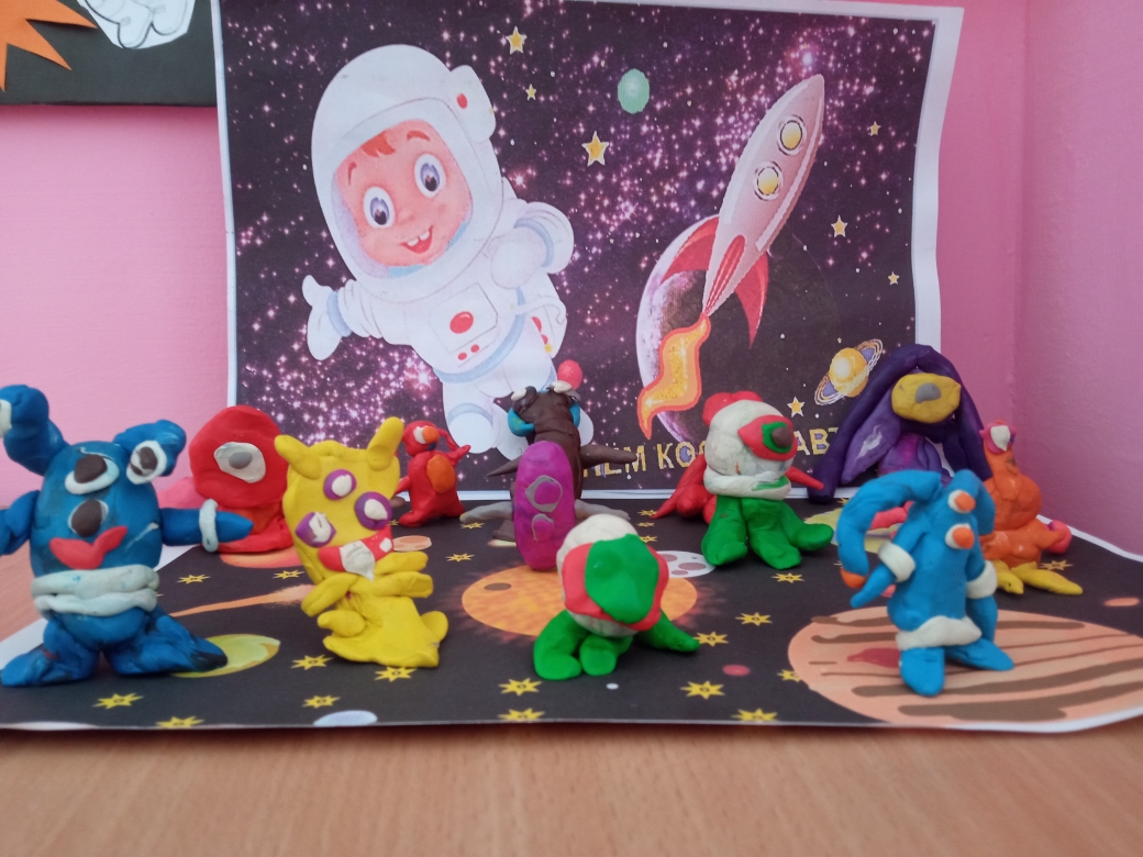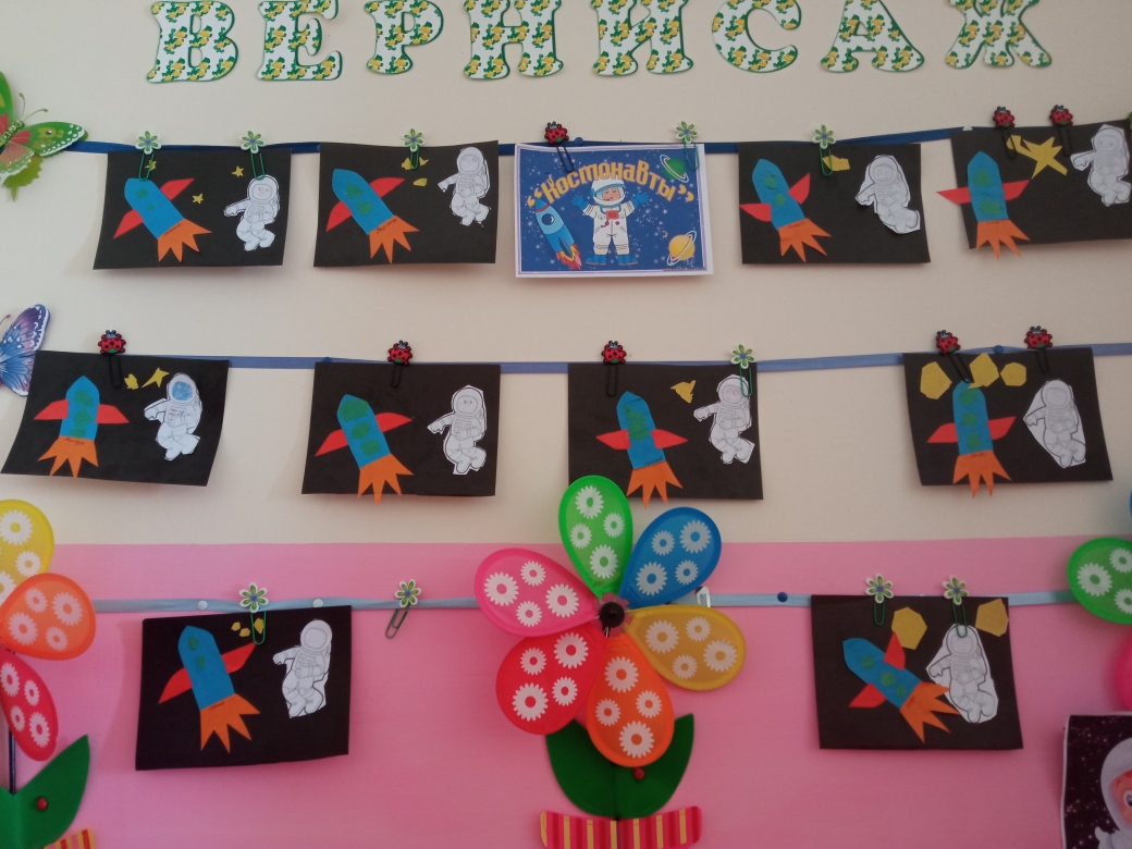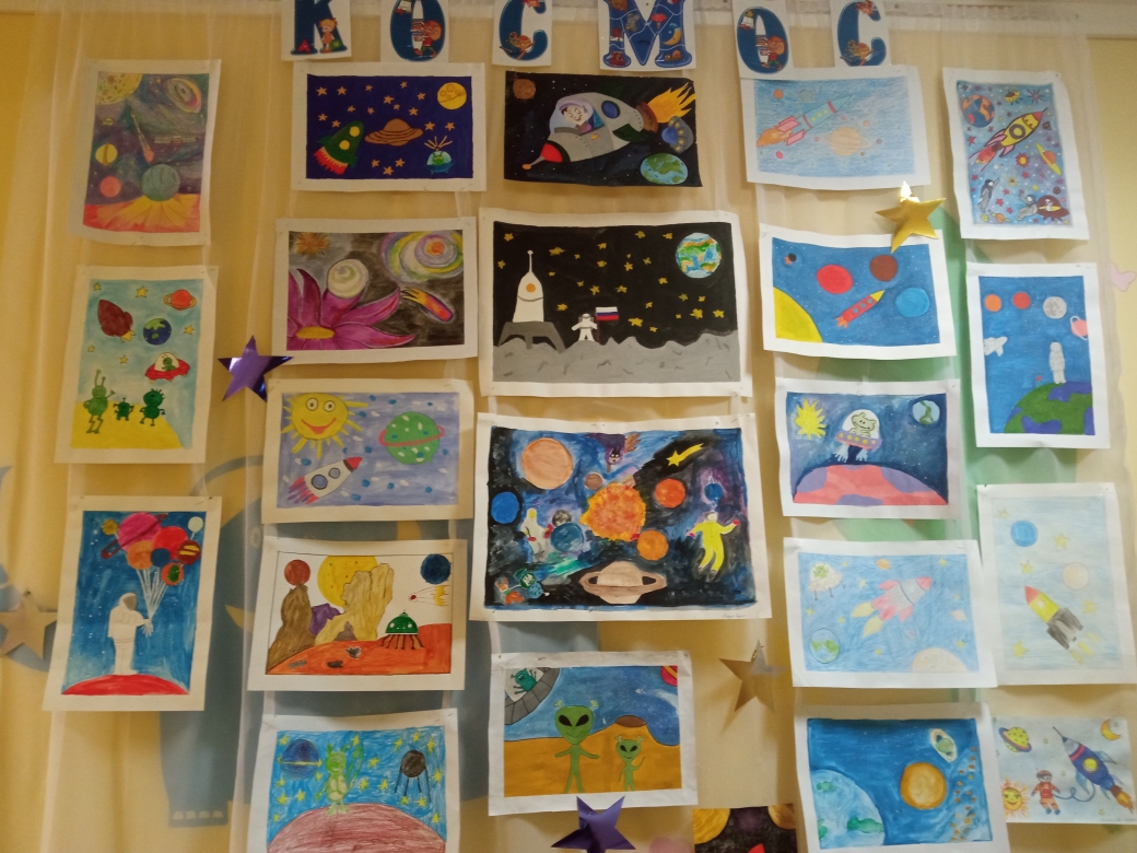 В группах были организованы творческие выставки на тему «Космос» с рисунками, поделками. В холле первого этажа оформлена выставка с оригинальными совместными работами родителей и детей. Тема космоса всегда интересна детям, поэтому, педагоги никогда не оставляют ее без внимания - проводятся беседы, познавательные занятия о звездах, планетах, космосе и космонавтах, оформляются групповые уголки, дети с удовольствием выполняют поделки.