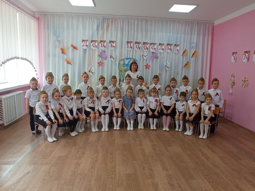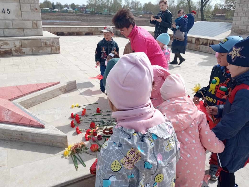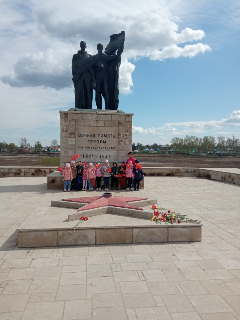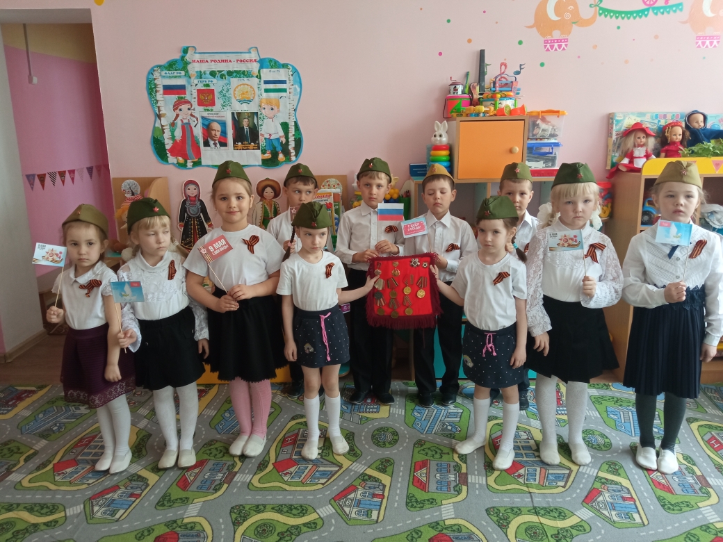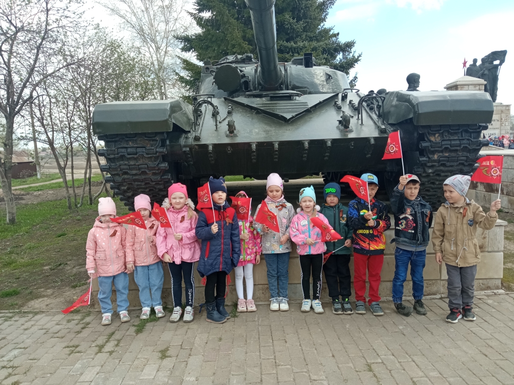 Такими словами можно было бы начинать каждое мероприятие, посвященное Дню Великой Победы. В преддверии празднования Дня Победы в старших группах прошли мероприятия, направленные на укрепление нравственно- патриотических чувств дошкольников, формирования знаний о ВОВ через различные виды деятельности. Вся работа проводилась с целью патриотического воспитания дошкольников, любви к своей Родине и уважения к людям, которые ковали Победу. Детям была представлена презентация «Никто не забыт и ничто не забыто» для развития общего кругозора. Также с детьми проводились беседы с показом демонстрационного материала «Их именами названы улицы», «Моя родословная», «Страна, в которой мы живём», «Мой прадедушка», «Пришла весна – весна Победы!», «Дети – герои войны», знакомили с названиями и достопримечательностями городов – героев Великой Отечественной войны. На занятиях и во время бесед дети узнали о героях войны, о подвигах детей в военное время. Ребята слушали рассказы о войне, сопереживали героям произведений, учили стихи, пели песни. Главным мероприятием был торжественный утренник посвящённый дню Победы. Было организовано возложение цветов к монументу воинам погибшим в годы ВОВ.