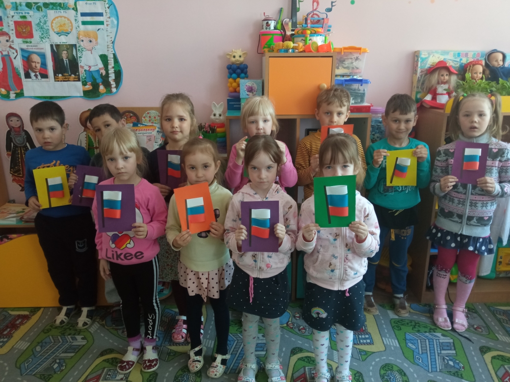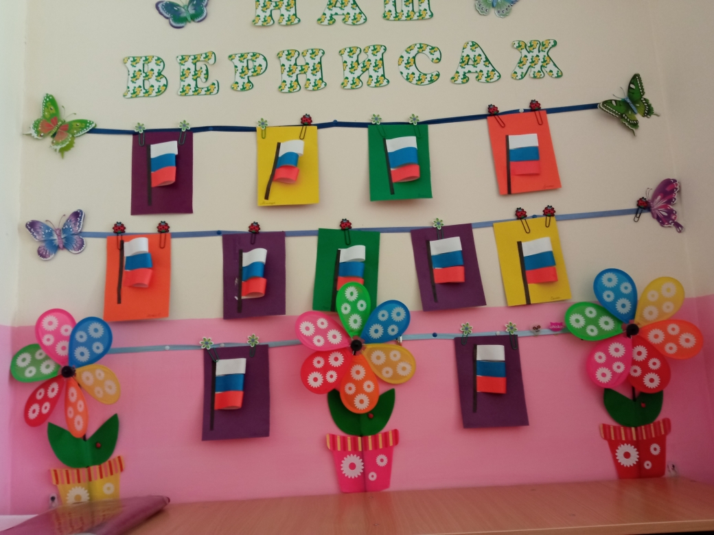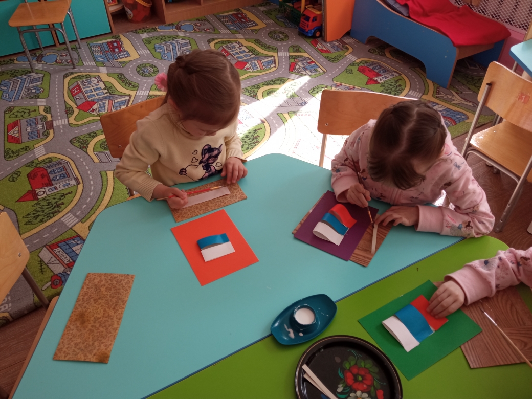 На занятии аппликации выполнили изображение флага в нетрадиционной форме.